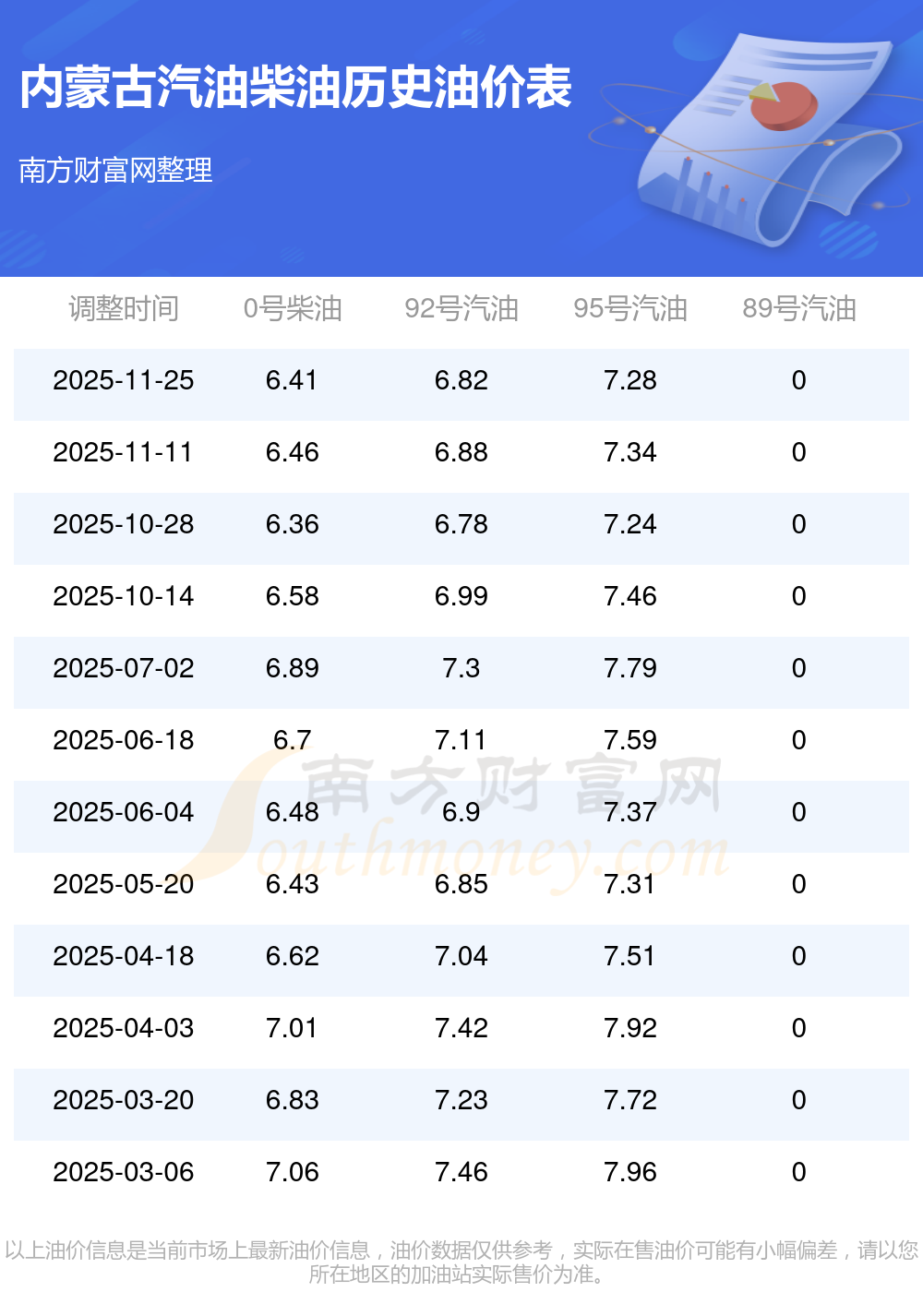 11月30日,內(nèi)蒙古0號(hào)柴油的價(jià)格是6.41元每升,本次的調(diào)整時(shí)間為11月25日,對(duì)比上次的調(diào)整跌了0.05元,跌0.774%,下次調(diào)整時(shí)間為12月8日24時(shí),還有8.71天。