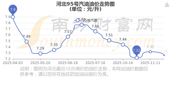 11月30日,河北95號(hào)汽油的價(jià)格是7.26元每升,本次的調(diào)整時(shí)間為11月25日,對(duì)比上次的調(diào)整下調(diào)了0.06元,下調(diào)0.82%,下次調(diào)整時(shí)間為12月8日24時(shí),還有8.71天。