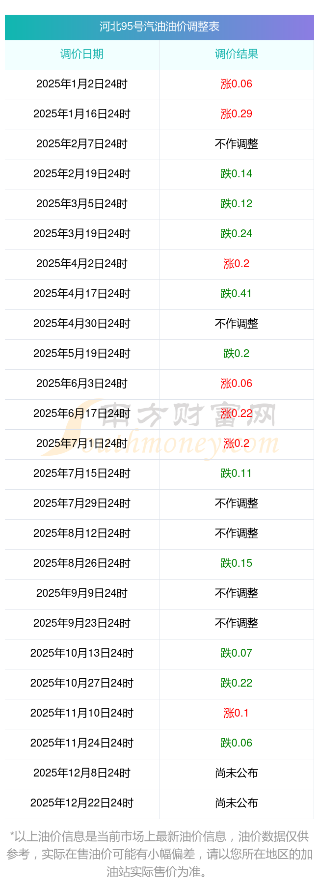 河北95號(hào)汽油油價(jià)調(diào)整表
