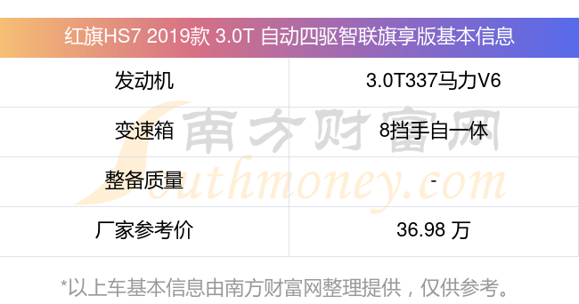 在動力上,紅旗HS7 2019款 3.0T 自動四驅(qū)智聯(lián)旗享版配備的是一臺3.0T337馬力V6機(jī)械增壓發(fā)動機(jī),匹配的是8擋手自一體自動檔變速箱,燃料形式為汽油,廠家參考價36.98萬元。