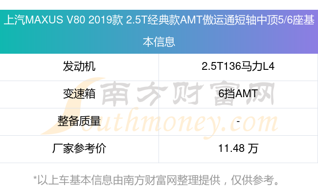 上汽MAXUS V80 2019款 2.5T經(jīng)典款A(yù)MT傲運通短軸中頂5/6座動力上搭載的是一臺2.5T136馬力L4渦輪增壓發(fā)動機,匹配6擋AMT自動檔變速箱,燃料形式為柴油,廠家參考價11.48萬元。