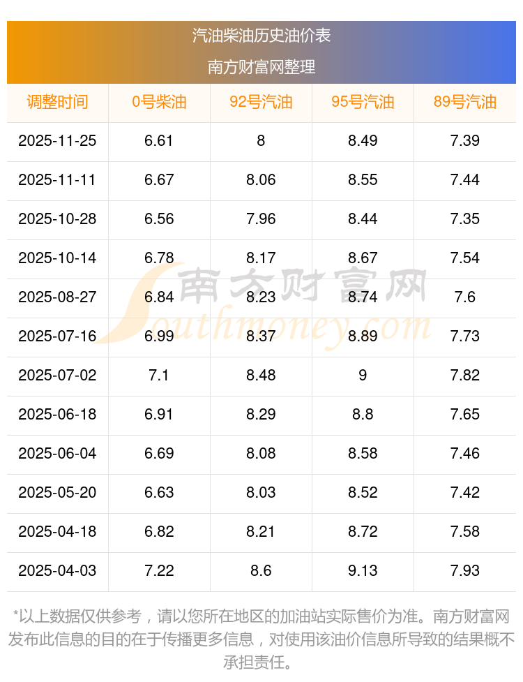 2025年92號(hào)汽油價(jià)格一覽表