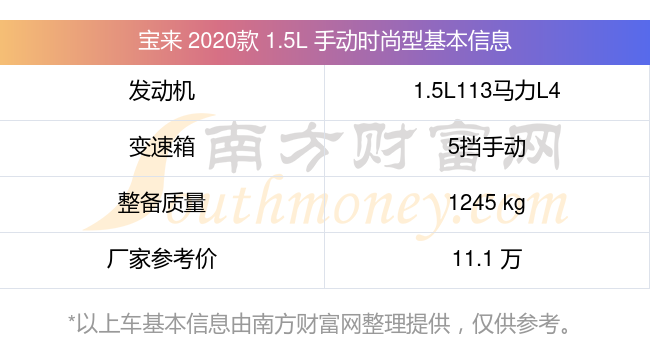 在動(dòng)力方面,寶來(lái) 2020款 1.5L 手動(dòng)時(shí)尚型搭載的是一臺(tái)1.5L113馬力L4自然吸氣發(fā)動(dòng)機(jī),匹配5擋手動(dòng)擋變速箱,燃料形式為汽油,常規(guī)整備質(zhì)量1245kg,廠家參考價(jià)11.1萬(wàn)元。