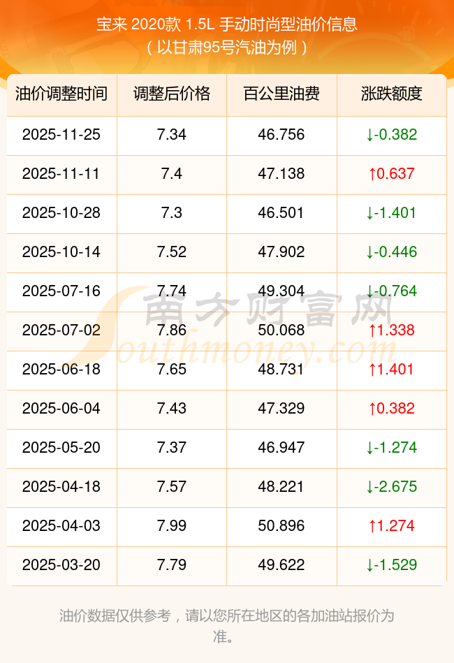 按11月25日95號(hào)汽油最新調(diào)整價(jià)格7.34元每升來(lái)計(jì)算(以甘肅為例),該車(chē)型百公里平均油費(fèi)為46.756元,按上一輪11月11日調(diào)整價(jià)格7.4元每升來(lái)計(jì)算,百公里平均油費(fèi)為47.138元,對(duì)比上一輪少花0.382元,下一輪油價(jià)調(diào)整時(shí)間為12月8日24時(shí)。