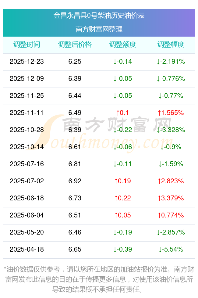 12月24日金昌永昌縣0號柴油歷史油價一覽表