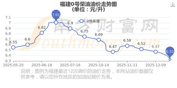 12月24日,福建0號(hào)柴油的價(jià)格是6.33元每升,本次的調(diào)整時(shí)間為12月23日,對(duì)比上次的調(diào)整下跌了0.14元,下跌2.164%,12月31日24時(shí)為下一輪油價(jià)調(diào)整時(shí)間,還有0天。