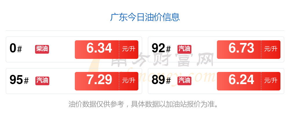 油價(jià)調(diào)整最新消息:廣東汽油、柴油12月24日每升最新價(jià)格為12月23日調(diào)整后的價(jià)格,92號(hào)汽油為6.73元,下跌了0.13元;95號(hào)汽油為7.29元,下跌了0.14元;89號(hào)汽油為6.24元,下跌了0.13;0號(hào)柴油為6.34元,下跌了0.15元。下一輪油價(jià)調(diào)整時(shí)間12月31日24時(shí)。