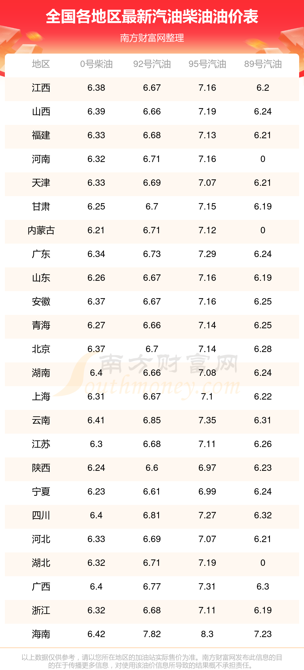 89號汽油平均價格:6元每升,其中,最高為海南,價格7.23元/升,最低為浙江,價格6.19元/升。