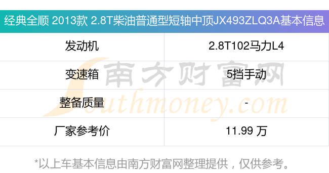 經(jīng)典全順 2013款 2.8T柴油普通型短軸中頂JX493ZLQ3A動力上搭載的是一臺2.8T102馬力L4渦輪增壓發(fā)動機(jī),匹配5擋手動擋變速箱,燃料形式為柴油,廠家參考價11.99萬元。