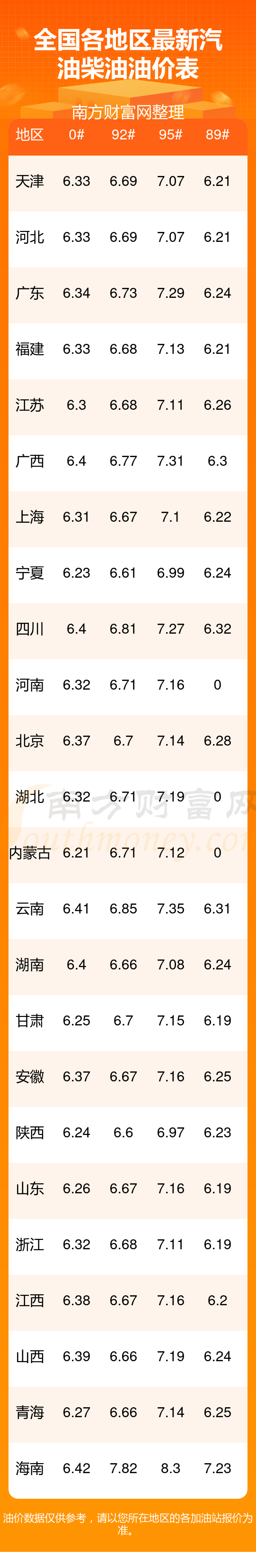 本次油價的調(diào)整時間為12月23日,調(diào)整后全國油價詳情為:92號汽油平均價格為7元每升,其中,最低的是陜西,6.60元每升,最高的是海南,7.82元每升。95號汽油平均價格為7元每升,其中,最低的是陜西,6.97元每升,最高的是海南,8.30元每升。0號柴油平均價格為:6元每升,其中,最低的是內(nèi)蒙古,6.21元每升,最高的是海南,6.42元每升。89號汽油平均價格為6元每升,其中,最低的是浙江,6.19元每升,最高的是海南,7.23元每升。,下一輪油價調(diào)整時間12月31日24時,距離現(xiàn)在還有0天。