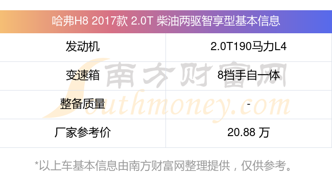 哈弗H8 2017款 2.0T 柴油兩驅(qū)智享型動(dòng)力上配備的是一臺(tái)2.0T190馬力L4雙渦輪增壓發(fā)動(dòng)機(jī),匹配的是8擋手自一體自動(dòng)檔變速箱,燃料形式為柴油,廠家參考價(jià)20.88萬(wàn)元。