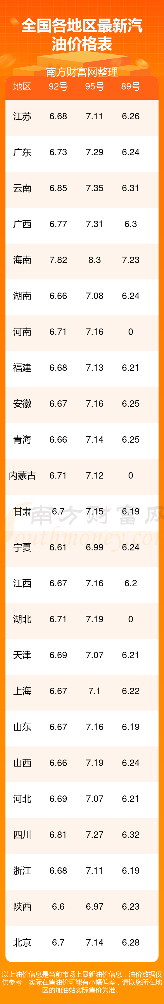 以上數(shù)據(jù)僅供參考,請以您所在地區(qū)的加油站實際售價為準。南方財富網(wǎng)發(fā)布此信息的目的在于傳播更多信息,對使用該油價信息所導(dǎo)致的結(jié)果概不承擔責任。