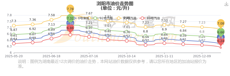 瀏陽市12月26日92號(hào)汽油歷史油價(jià)調(diào)整走勢圖