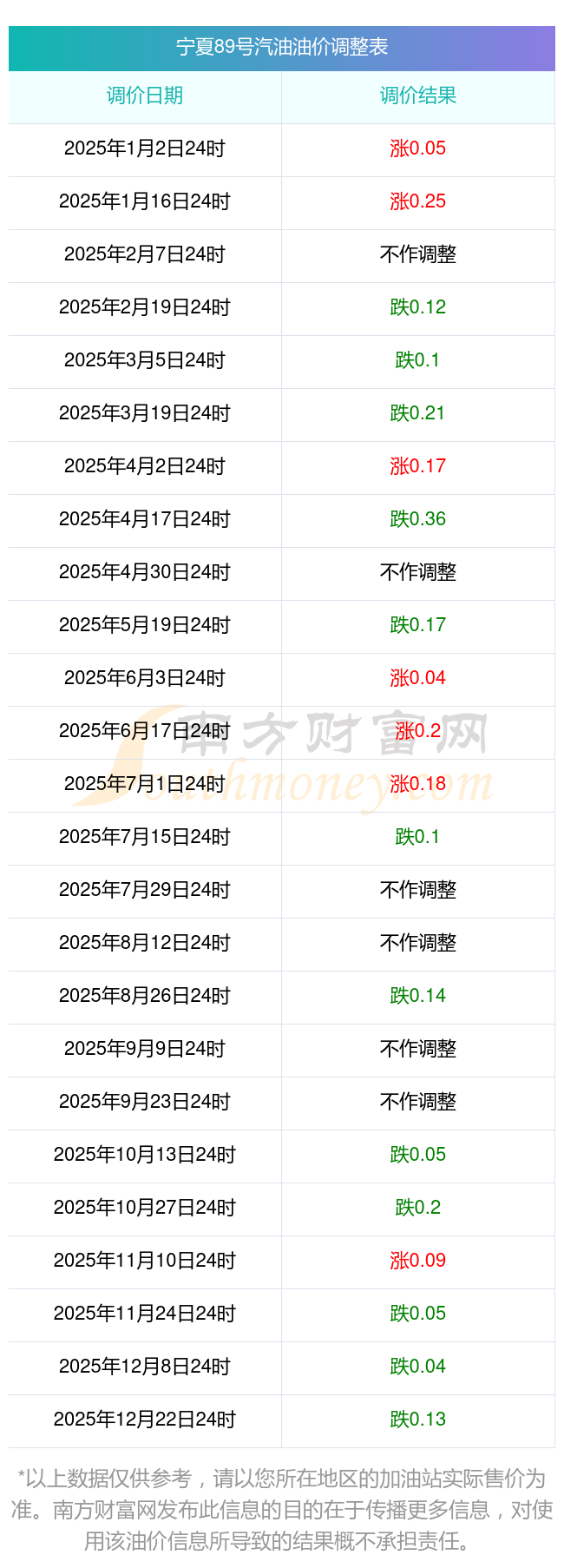 12月30日,寧夏89號汽油的價格是6.24元每升,本次的調(diào)整時間為12月23日,對比上次的調(diào)整下調(diào)了0.13元,下調(diào)2.041%,12月31日24時為下一輪油價調(diào)整時間,還有0天。