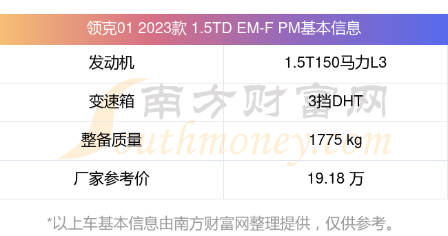 領(lǐng)克01 2023款 1.5TD EM-F PM動力上搭載的是一臺1.5T150馬力L3渦輪增壓發(fā)動機,匹配3擋DHT自動檔變速箱,燃料形式為油電混合,常規(guī)整備質(zhì)量1775kg,廠家參考價19.18萬元。