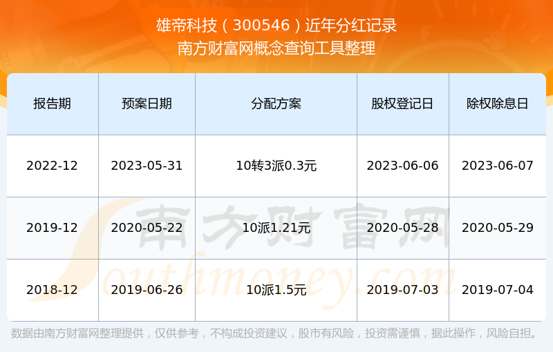 雄帝科技最新一次公布的分紅方案為10轉(zhuǎn)3派0.3元。本次權(quán)益分派股權(quán)登記日為2023年6月6日,除權(quán)除息日為2023年6月7日,派息日為2023年6月7日。