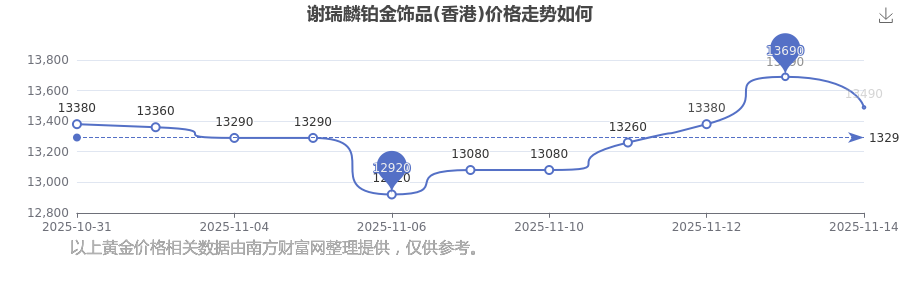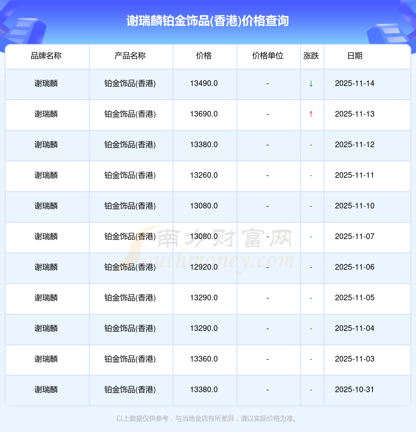 2025年11月15日謝瑞麟鉑金飾品(香港)價(jià)格查詢:13490.0。