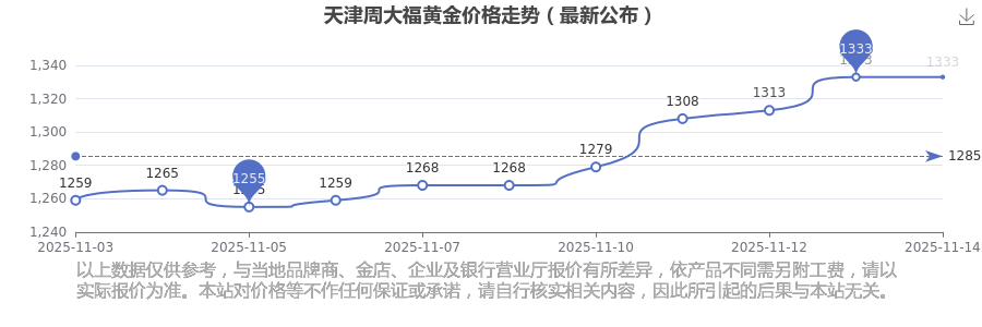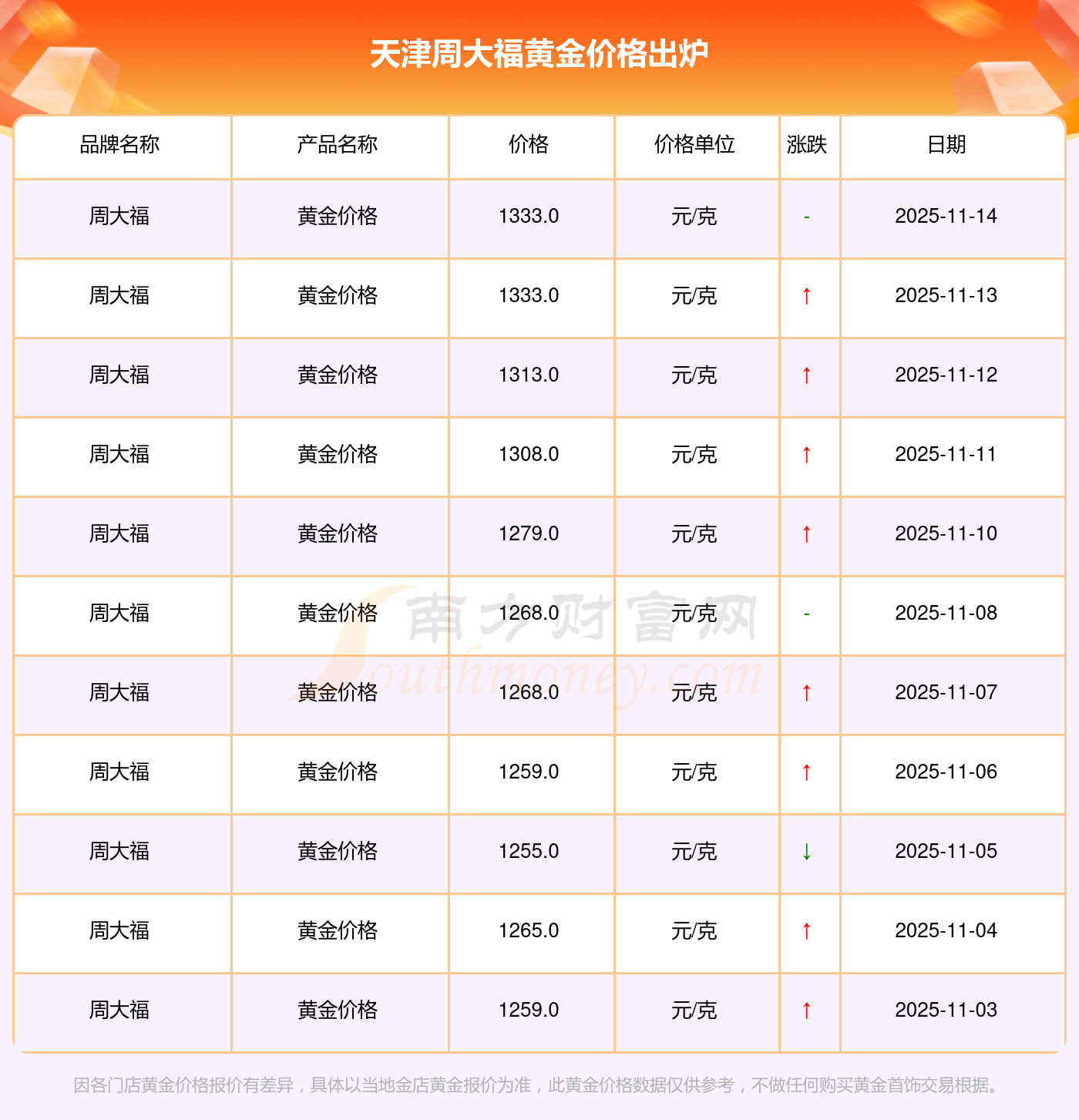 今日(2025年11月15日),天津周大福黃金價格每克的價值為1333.0元/克。