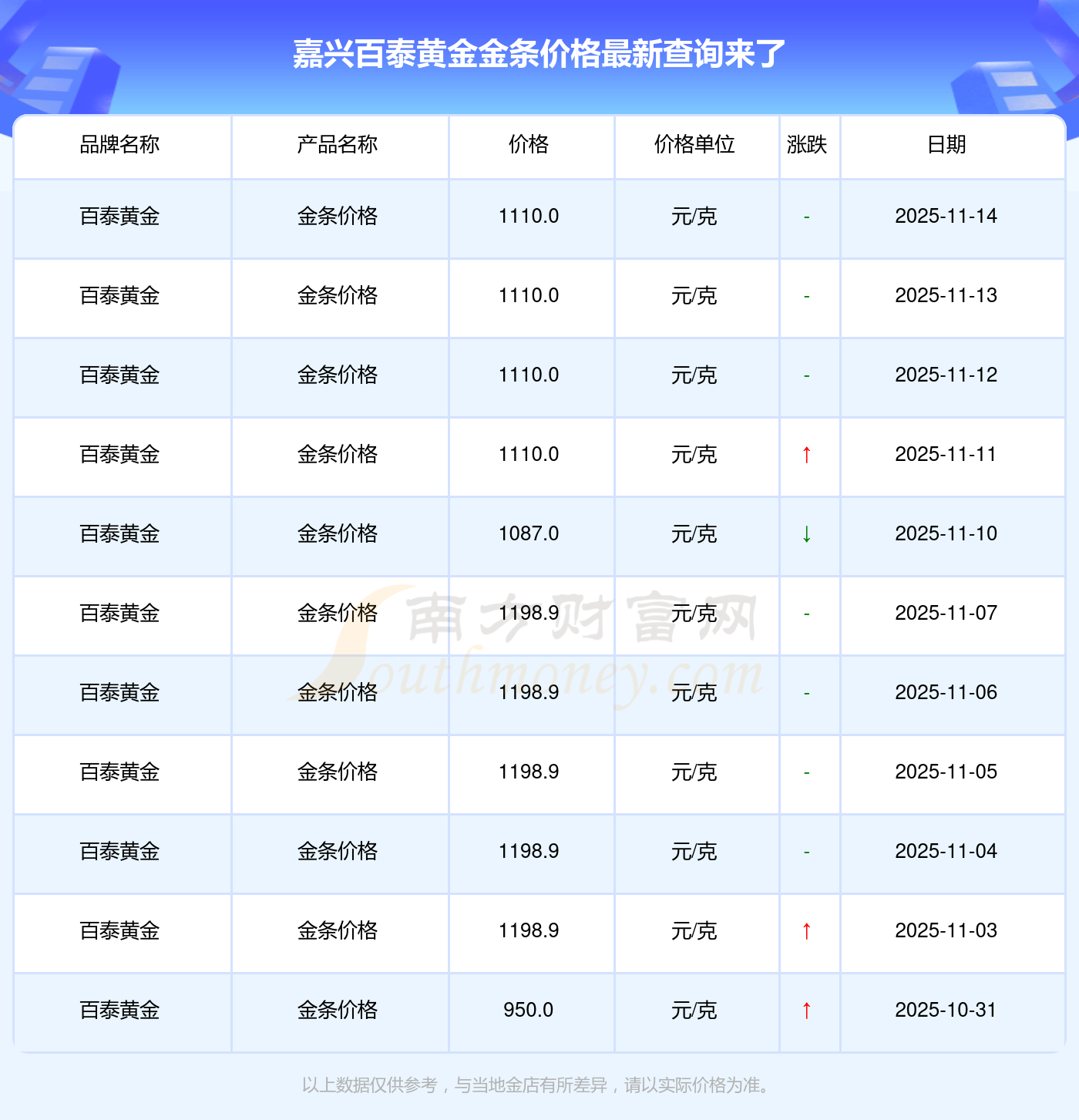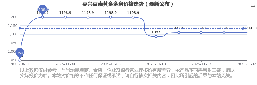 今日(2025年11月15日),嘉興百泰黃金金條價(jià)格:1110.0元/克。