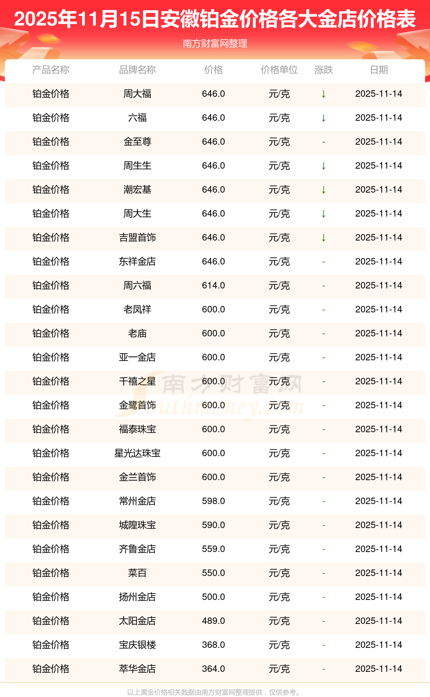 今天是2025年11月15日,安徽周大福、周大福、周大福、周大福、周大福、周大福、周大福、老鳳祥、老鳳祥、老鳳祥、周六福等各大金店品牌鉑金價(jià)格最新價(jià)格如下:周大福1333.0元/克、周大福646.0元/克、周大福1333.0元/克、周大福46320.0、周大福18410.0、周大福41780.0、周大福1167.0元/克、老鳳祥1322.0元/克、老鳳祥600.0元/克、老鳳祥1322.0元/克、周六福1295.0元/克。