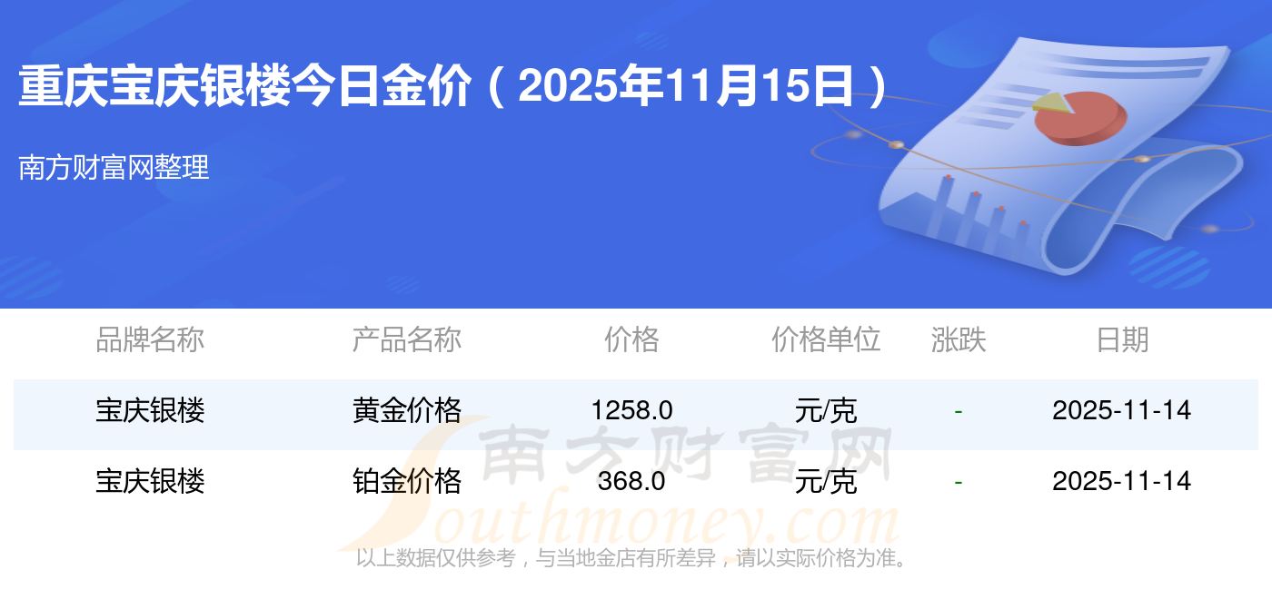 2025年11月15日重慶寶慶銀樓最新價(jià)格:黃金價(jià)格1333.0元/克,鉑金價(jià)格646.0元/克,飾品金價(jià)(內(nèi)地)1333.0元/克,黃金飾品(香港)46320.0,鉑金價(jià)格(香港)18410.0,金條價(jià)格(香港)41780.0,金條金價(jià)(內(nèi)地)1167.0元/克,黃金價(jià)格1322.0元/克,鉑金價(jià)格600.0元/克,足金價(jià)格1322.0元/克,黃金價(jià)格1295.0元/克。