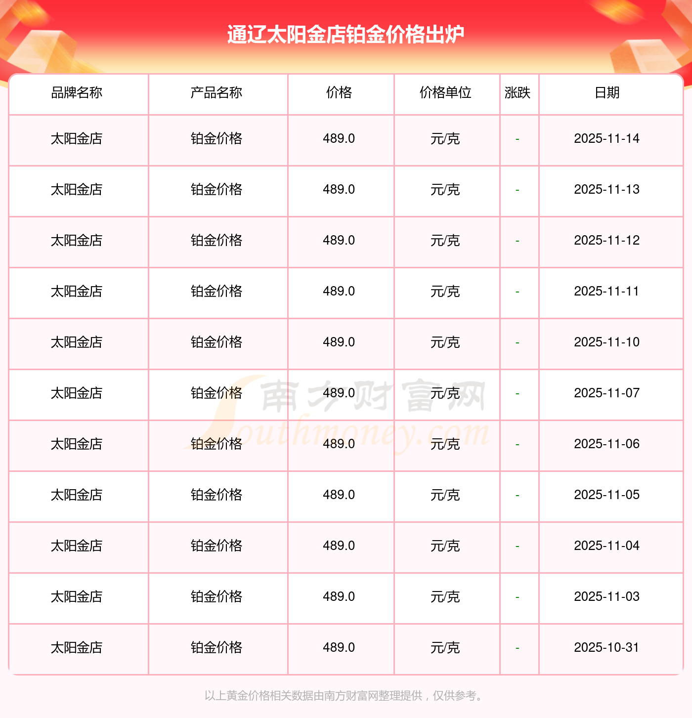 通遼太陽金店鉑金價格每克多少錢,今天黃金一克的價格具體是多少?今日通遼太陽金店鉑金價格查詢,今日(2025年11月15日),489.0元/克是通遼太陽金店鉑金價格的價格標準。