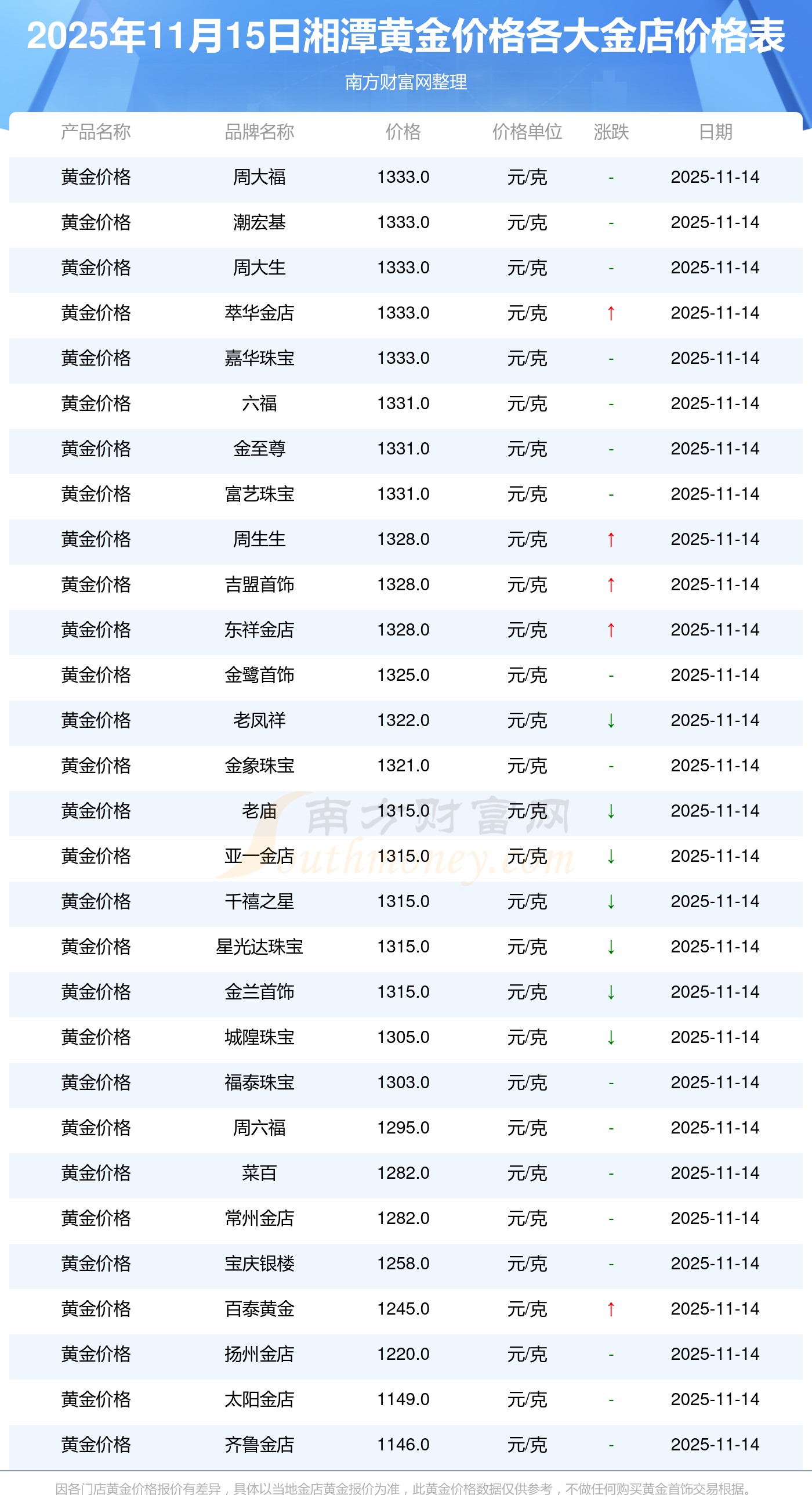 2025年11月15日湘潭各大金店黃金價(jià)格最新價(jià)格查詢來了:周大福1333.0元/克,周大福646.0元/克,周大福1333.0元/克,周大福46320.0,周大福18410.0,周大福41780.0,周大福1167.0元/克,老鳳祥1322.0元/克,老鳳祥600.0元/克,老鳳祥1322.0元/克,周六福1295.0元/克。