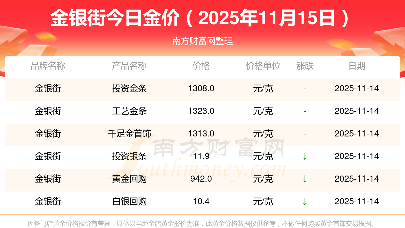 2025年11月15日金銀街金價(jià)查詢:黃金價(jià)格1333.0元/克,鉑金價(jià)格646.0元/克,飾品金價(jià)(內(nèi)地)1333.0元/克,黃金飾品(香港)46320.0,鉑金價(jià)格(香港)18410.0,金條價(jià)格(香港)41780.0,金條金價(jià)(內(nèi)地)1167.0元/克,黃金價(jià)格1322.0元/克,鉑金價(jià)格600.0元/克,足金價(jià)格1322.0元/克,黃金價(jià)格1295.0元/克。