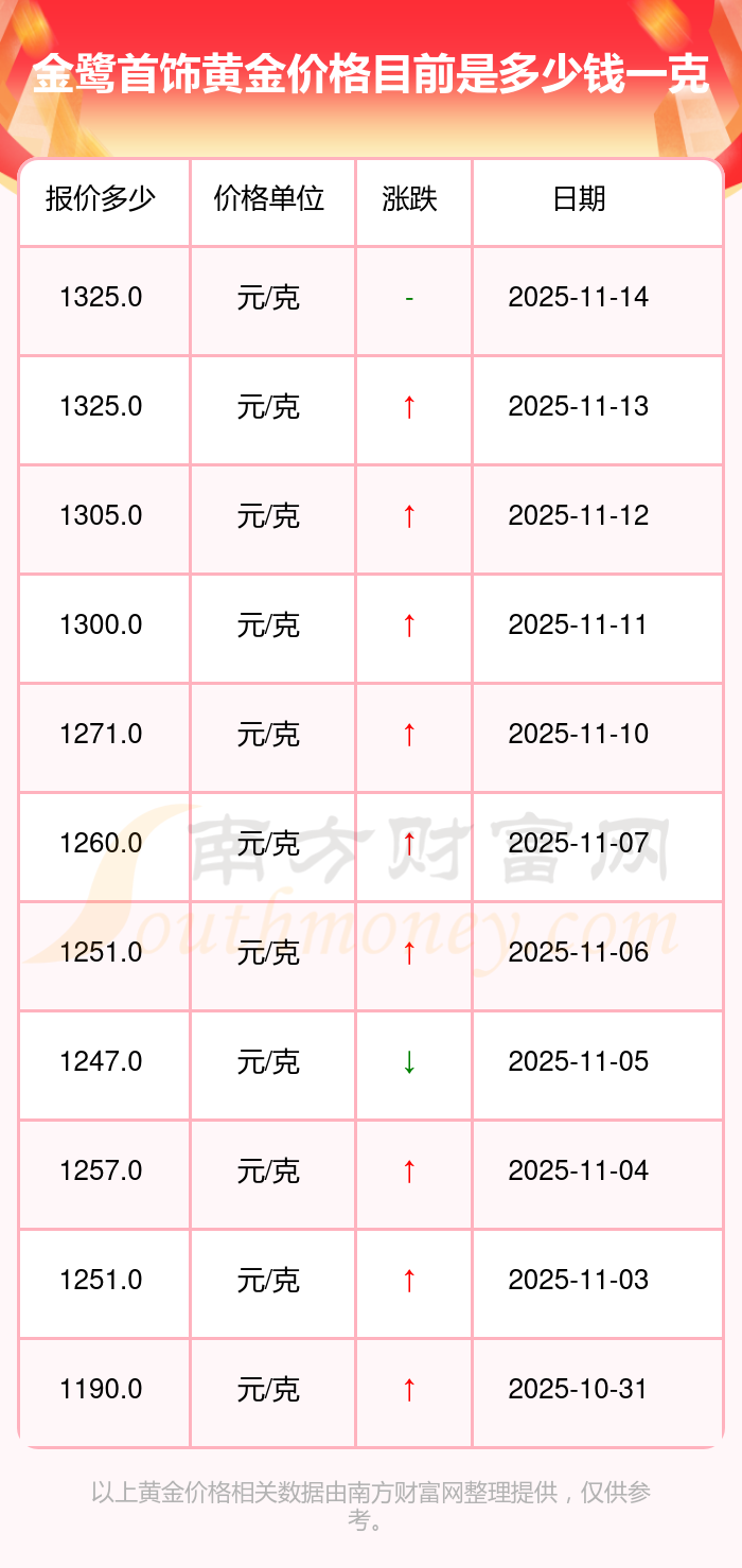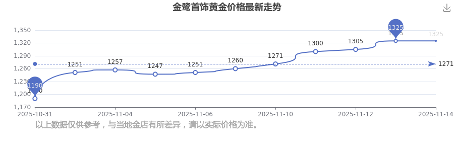 想查詢當下黃金價格,今日黃金一克的價格是多少呢?黃金每一克的價錢一般是多少呀?今日(2025年11月15日),金鷺首飾黃金價格最新價格是1325.0元/克。