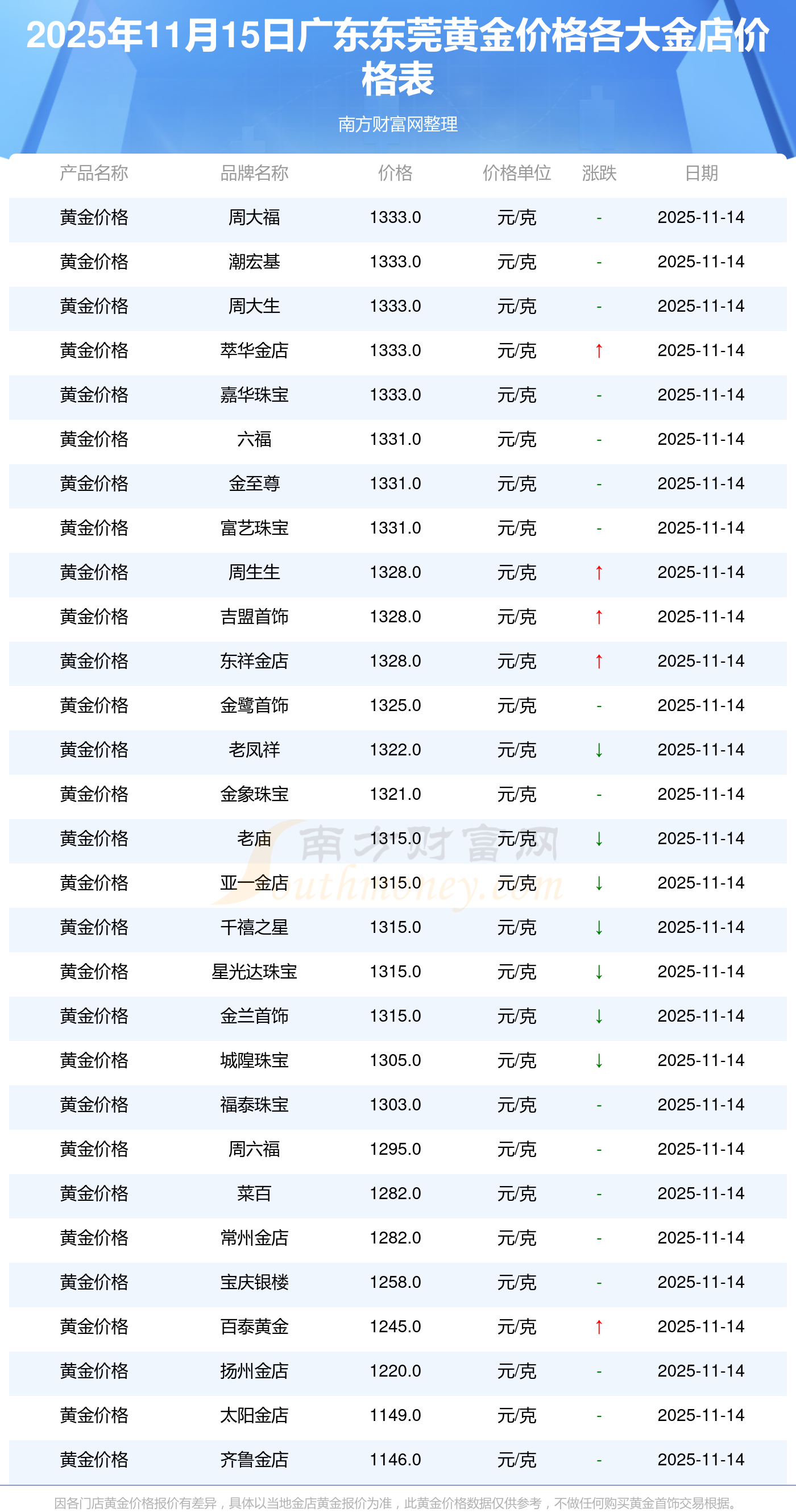 今天是2025年11月15日,廣東東莞周大福、周大福、周大福、周大福、周大福、周大福、周大福、老鳳祥、老鳳祥、老鳳祥、周六福等各大金店品牌黃金價(jià)格最新價(jià)格如下:周大福1333.0元/克、周大福646.0元/克、周大福1333.0元/克、周大福46320.0、周大福18410.0、周大福41780.0、周大福1167.0元/克、老鳳祥1322.0元/克、老鳳祥600.0元/克、老鳳祥1322.0元/克、周六福1295.0元/克。