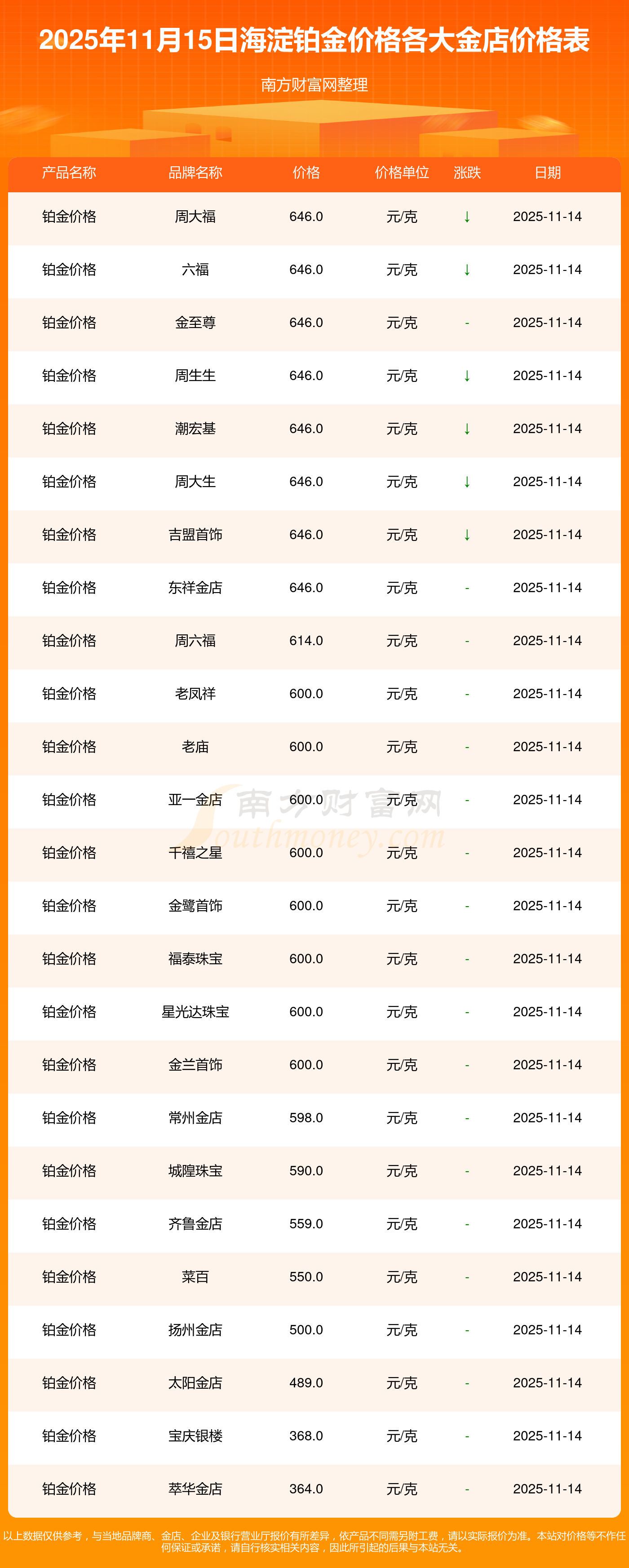 2025年11月15日海淀各大金店鉑金價(jià)格最新價(jià)格查詢來了:周大福1333.0元/克,周大福646.0元/克,周大福1333.0元/克,周大福46320.0,周大福18410.0,周大福41780.0,周大福1167.0元/克,老鳳祥1322.0元/克,老鳳祥600.0元/克,老鳳祥1322.0元/克,周六福1295.0元/克。