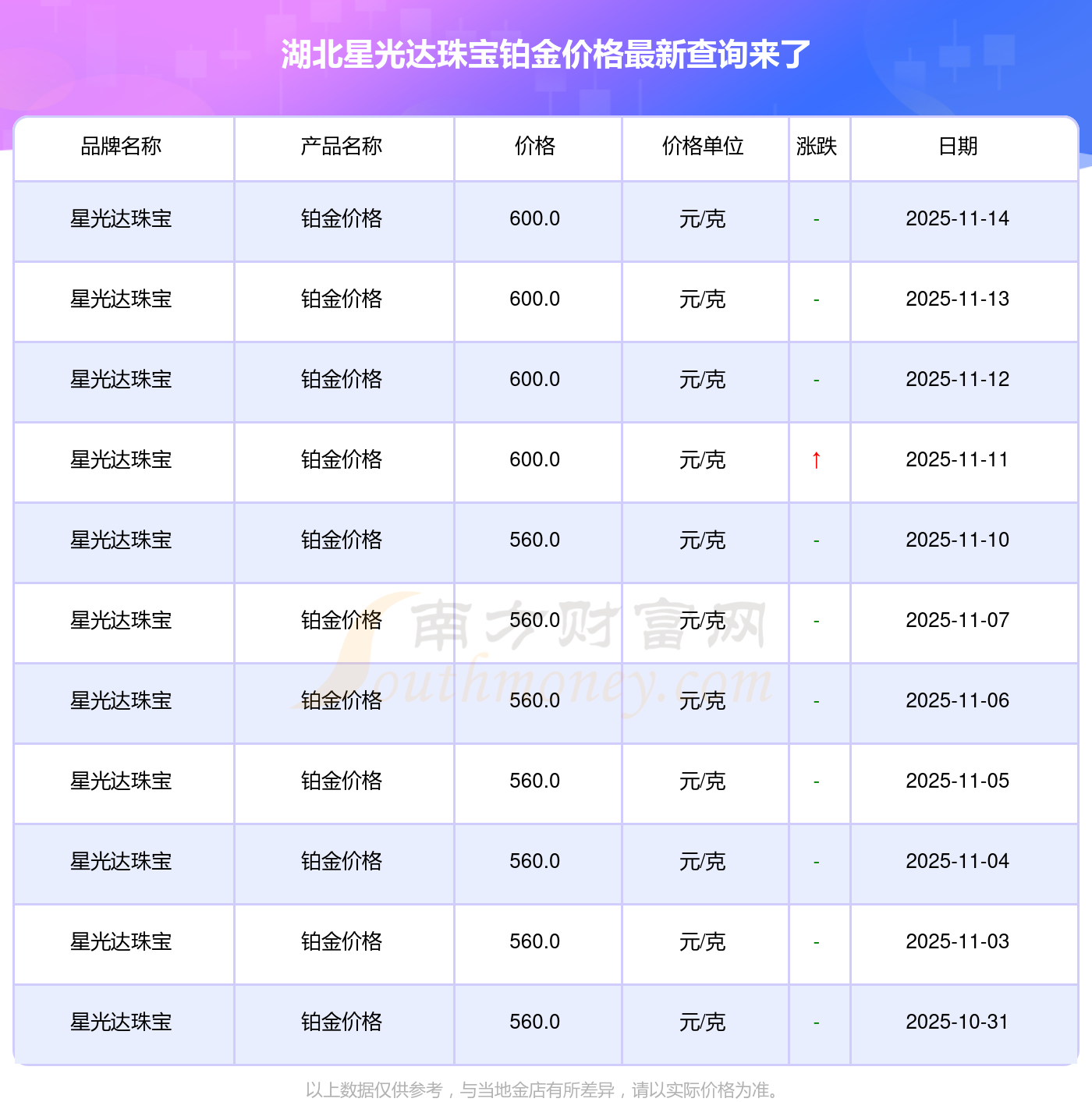 今日(2025年11月15日)湖北星光達(dá)珠寶鉑金價(jià)格是600.0元/克。