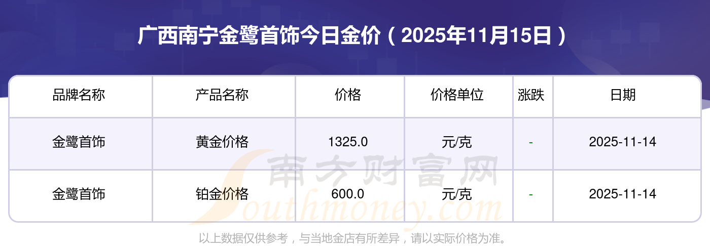 2025年11月15日廣西南寧金鷺首飾黃金價(jià)格最新查詢(金鷺首飾今日黃金價(jià)格多少錢一克),隨小編來了解一下詳情。