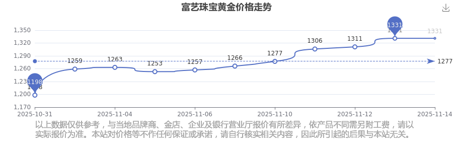 今日(2025年11月15日),富藝珠寶黃金價格:1331.0元/克。