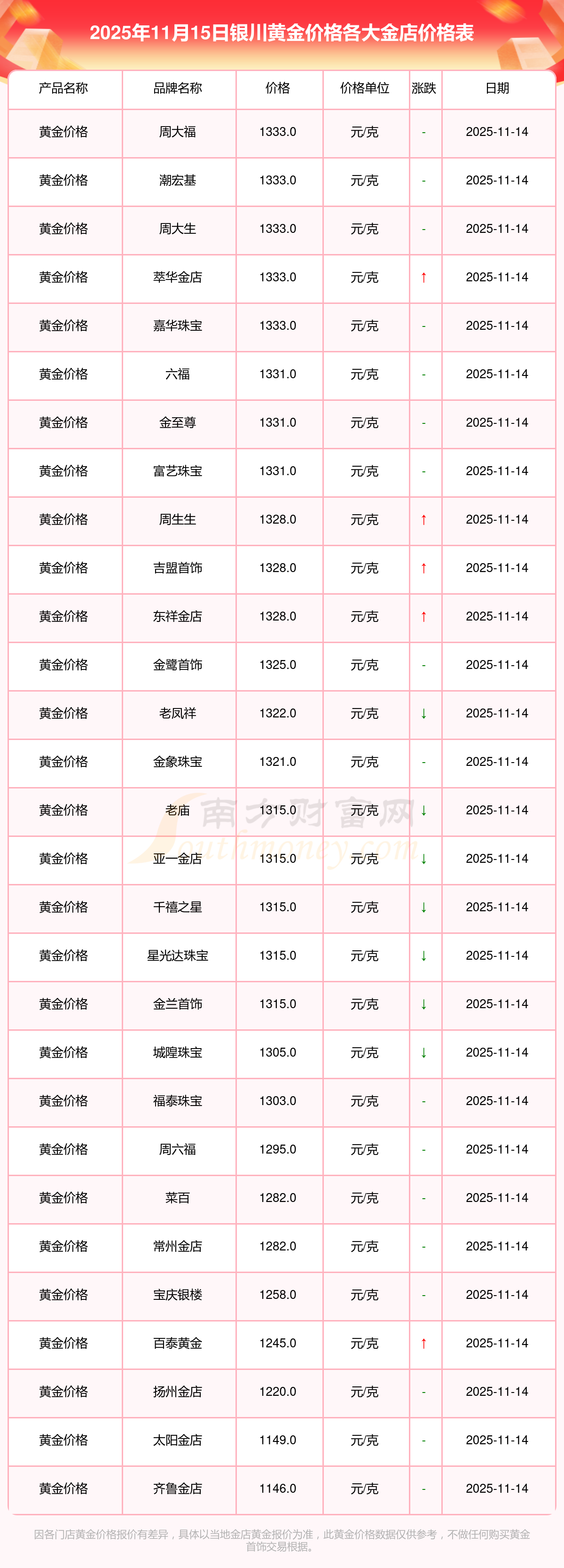 以上數(shù)據(jù)僅供參考,與當(dāng)?shù)仄放粕、金店、企業(yè)及銀行營業(yè)廳報(bào)價(jià)有所差異,依產(chǎn)品不同需另附工費(fèi),請以實(shí)際報(bào)價(jià)為準(zhǔn)。本站對價(jià)格等不作任何保證或承諾,請自行核實(shí)相關(guān)內(nèi)容,因此所引起的后果與本站無關(guān)。