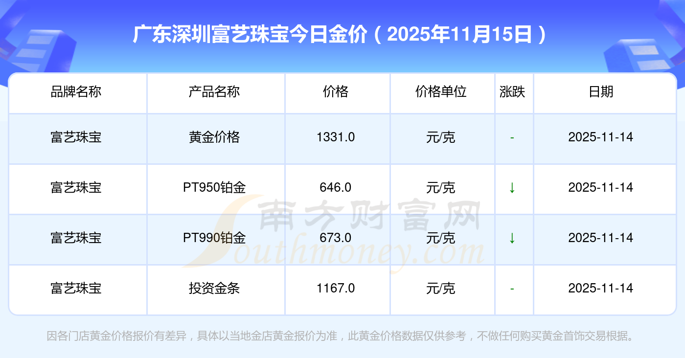 2025年11月15日廣東深圳富藝珠寶現在黃金一克要多少錢:黃金價格1333.0元/克,鉑金價格646.0元/克,飾品金價(內地)1333.0元/克,黃金飾品(香港)46320.0,鉑金價格(香港)18410.0,金條價格(香港)41780.0,金條金價(內地)1167.0元/克,黃金價格1322.0元/克,鉑金價格600.0元/克,足金價格1322.0元/克,黃金價格1295.0元/克。