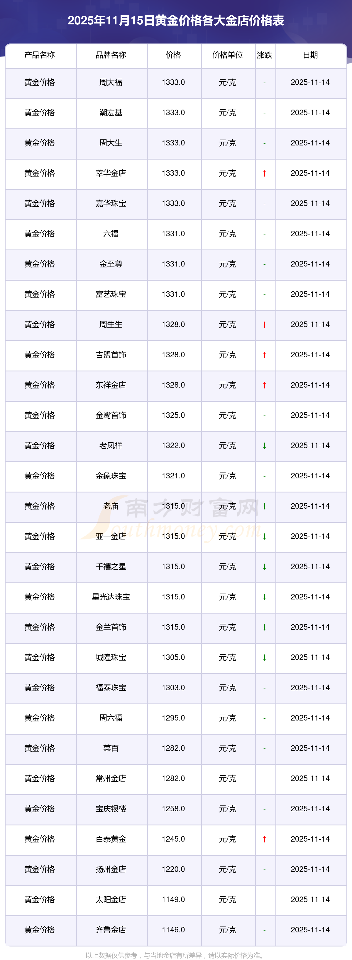 今天是2025年11月15日,周大福、周大福、周大福、周大福、周大福、周大福、周大福、老鳳祥、老鳳祥、老鳳祥、周六福等各大金店品牌黃金價(jià)格最新價(jià)格如下:周大福1333.0元/克、周大福646.0元/克、周大福1333.0元/克、周大福46320.0、周大福18410.0、周大福41780.0、周大福1167.0元/克、老鳳祥1322.0元/克、老鳳祥600.0元/克、老鳳祥1322.0元/克、周六福1295.0元/克。