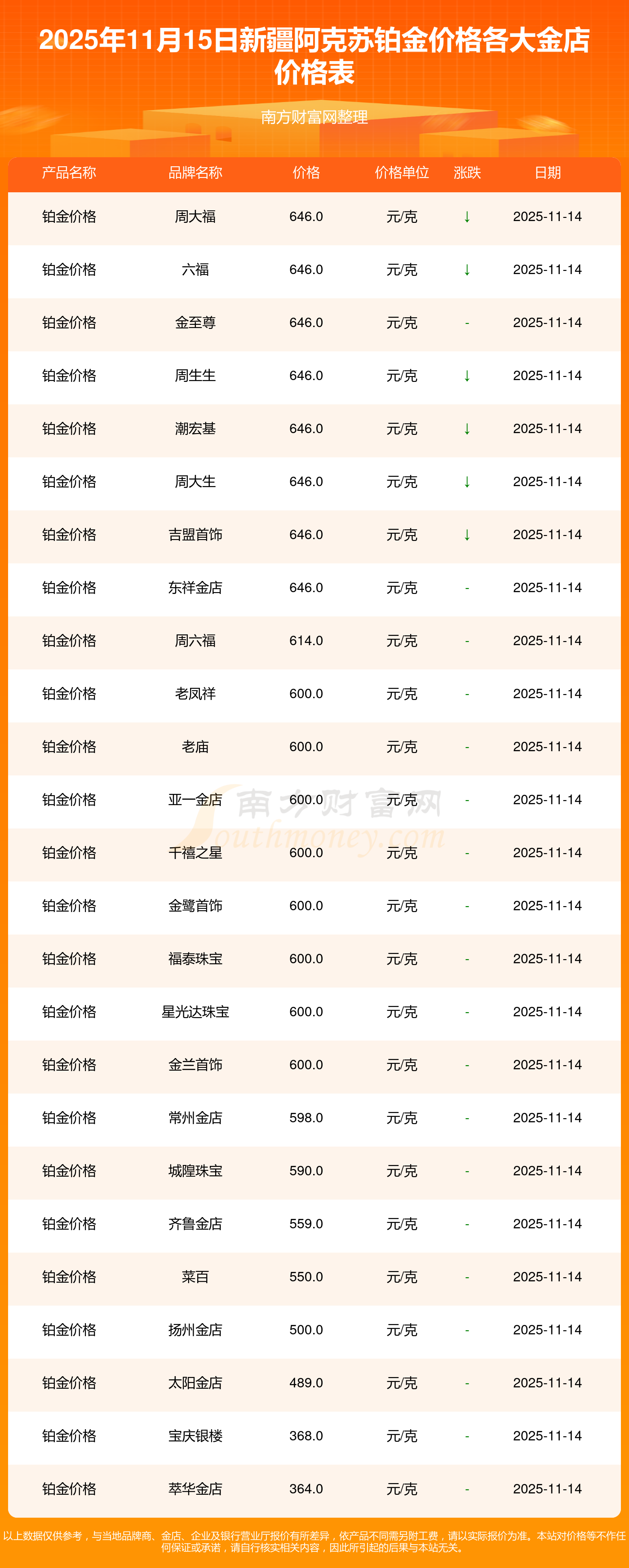 2025年11月15日新疆阿克蘇周大福、周大福、周大福、周大福、周大福、周大福、周大福、老鳳祥、老鳳祥、老鳳祥、周六福等各大金店品牌鉑金價(jià)格最新價(jià)格如下:周大福黃金價(jià)格1333.0元/克,周大福鉑金價(jià)格646.0元/克,周大福飾品金價(jià)(內(nèi)地)1333.0元/克,周大福黃金飾品(香港)46320.0,周大福鉑金價(jià)格(香港)18410.0,周大福金條價(jià)格(香港)41780.0,周大福金條金價(jià)(內(nèi)地)1167.0元/克,老鳳祥黃金價(jià)格1322.0元/克,老鳳祥鉑金價(jià)格600.0元/克,老鳳祥足金價(jià)格1322.0元/克,周六福黃金價(jià)格1295.0元/克。