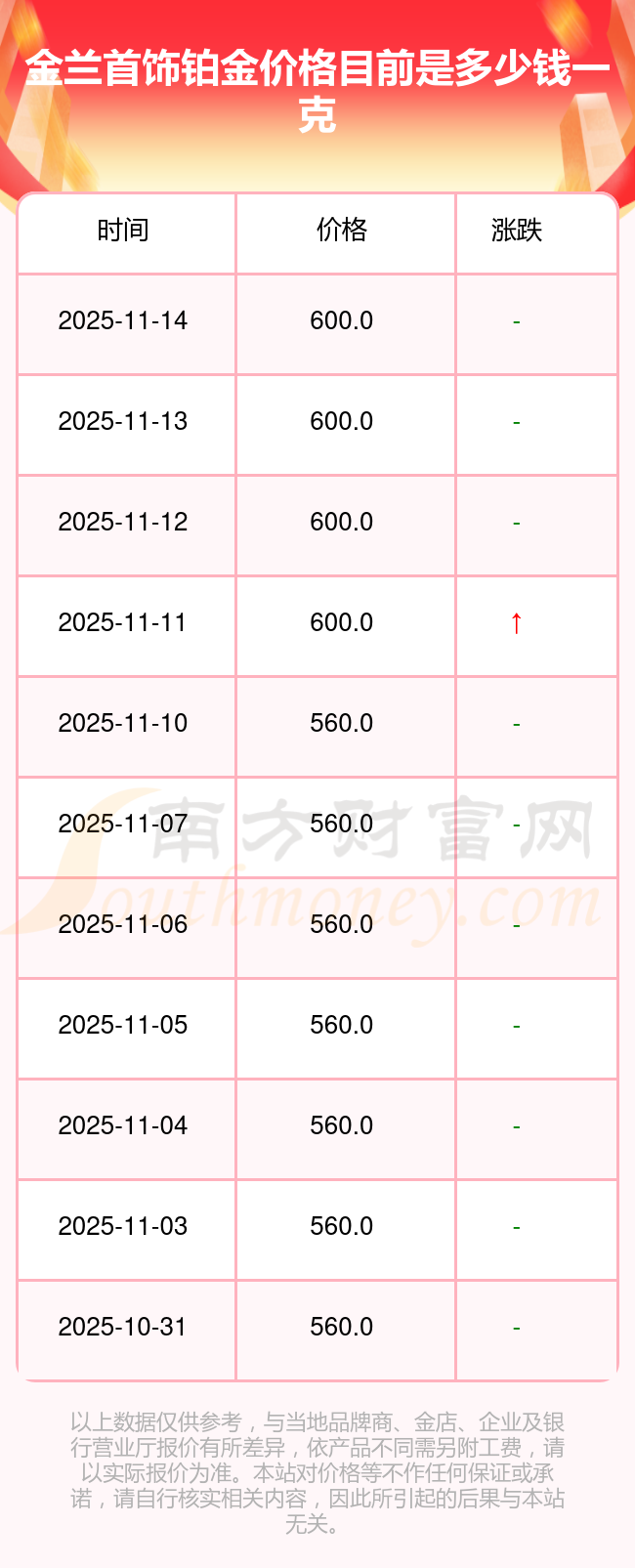 2025年11月15日金蘭首飾鉑金價格是600.0元/克。
