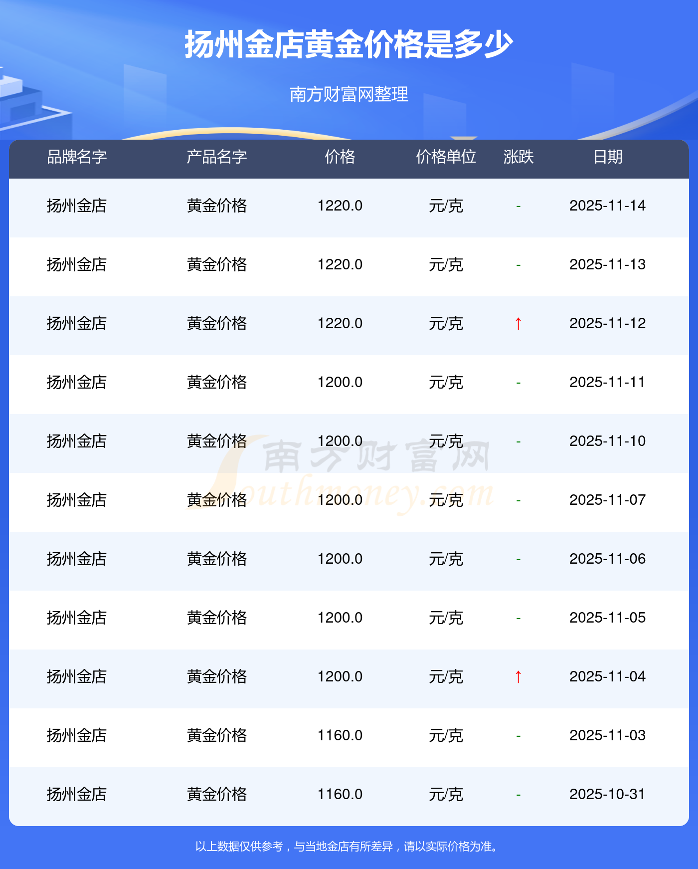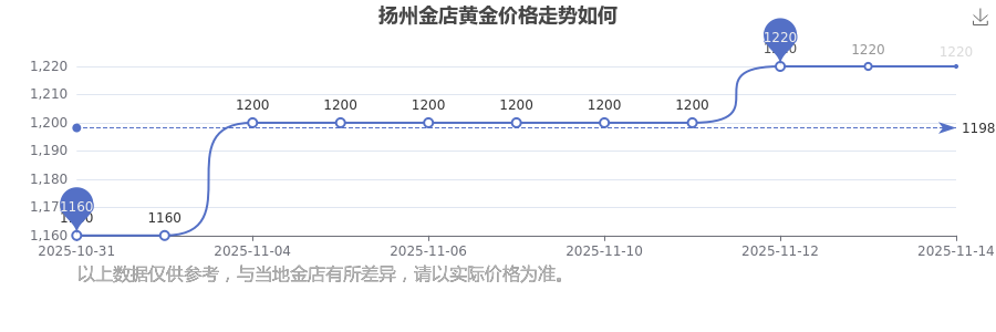2025年11月15日揚(yáng)州金店黃金價(jià)格是1220.0元/克。