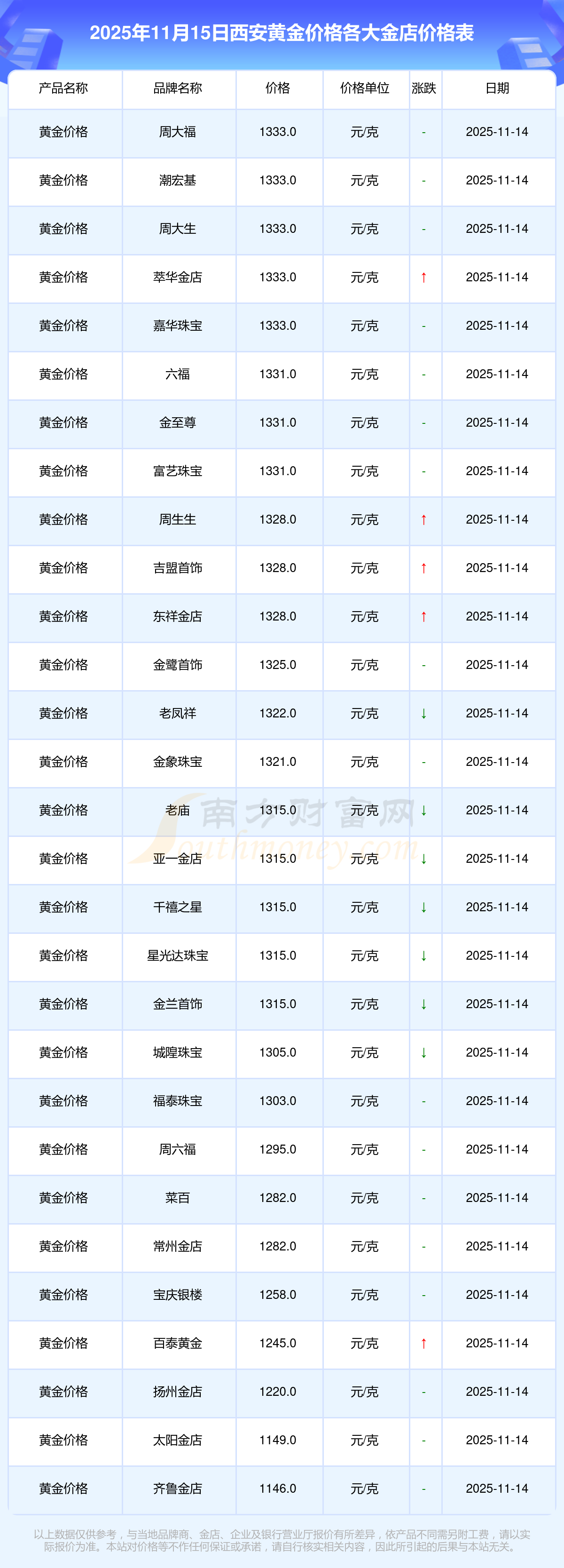 今天是2025年11月15日,西安周大福、周大福、周大福、周大福、周大福、周大福、周大福、老鳳祥、老鳳祥、老鳳祥、周六福等各大金店品牌黃金價(jià)格最新價(jià)格行情是這樣的:周大福1333.0元/克、周大福646.0元/克、周大福1333.0元/克、周大福46320.0、周大福18410.0、周大福41780.0、周大福1167.0元/克、老鳳祥1322.0元/克、老鳳祥600.0元/克、老鳳祥1322.0元/克、周六福1295.0元/克。