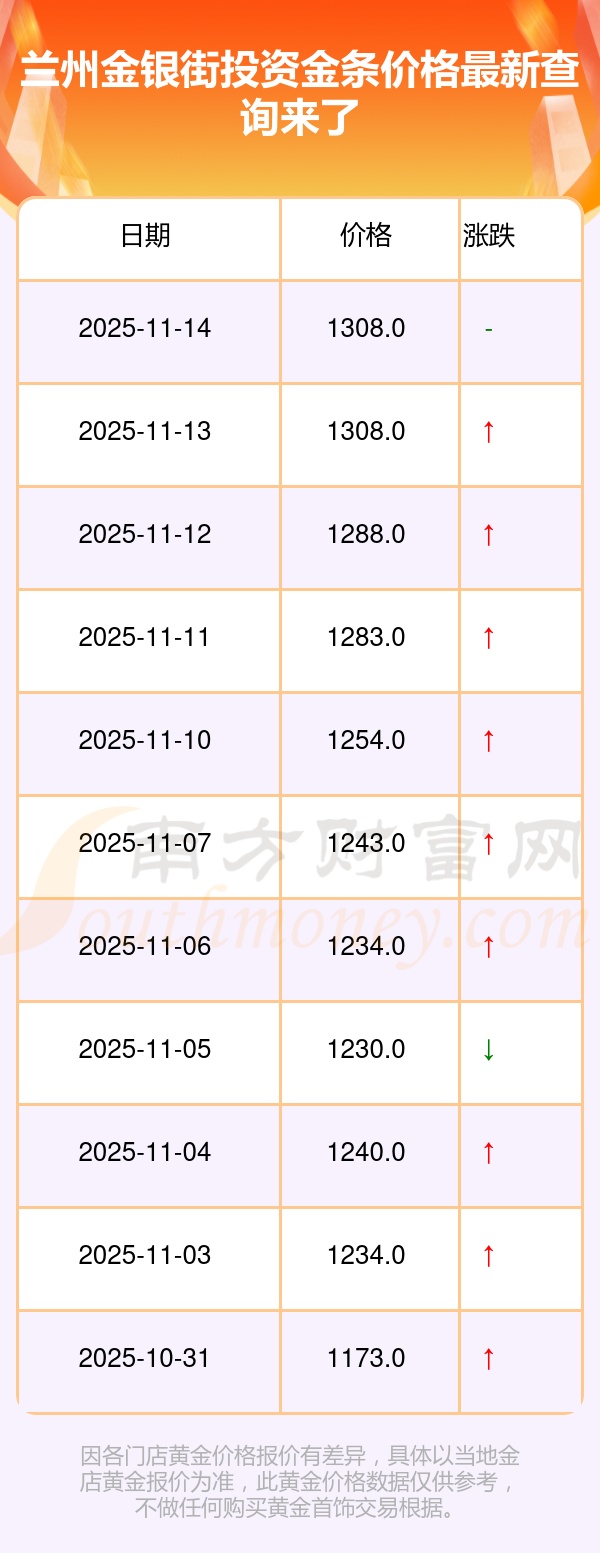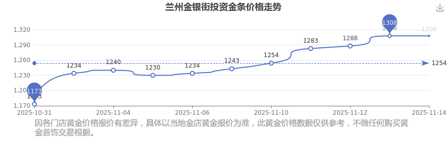 2025年11月15日,蘭州金銀街的投資金條標(biāo)價(jià)達(dá)到 1308.0元/克。
