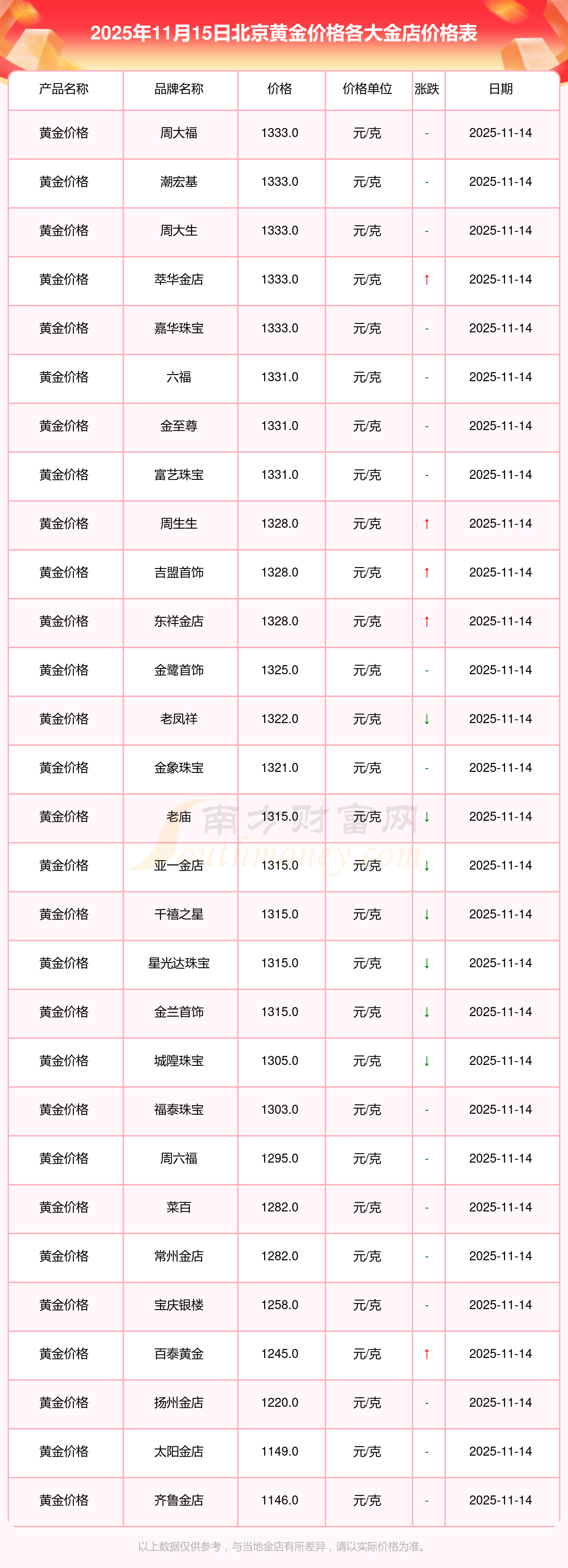 2025年11月15日,北京周大福、周大福、周大福、周大福、周大福、周大福、周大福、老鳳祥、老鳳祥、老鳳祥、周六福等各大金店品牌黃金價(jià)格今日價(jià)格行情最新來(lái)了:周大福1333.0元/克、周大福646.0元/克、周大福1333.0元/克、周大福46320.0、周大福18410.0、周大福41780.0、周大福1167.0元/克、老鳳祥1322.0元/克、老鳳祥600.0元/克、老鳳祥1322.0元/克、周六福1295.0元/克。