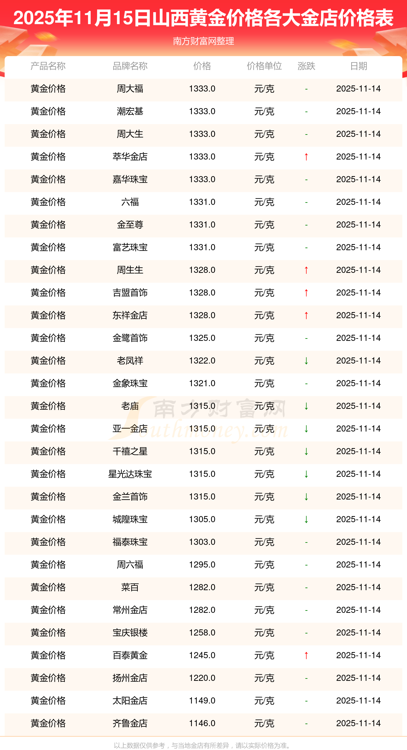 2025年11月15日,山西周大福、周大福、周大福、周大福、周大福、周大福、周大福、老鳳祥、老鳳祥、老鳳祥、周六福等各大金店品牌黃金價(jià)格今日價(jià)格如下:周大福1333.0元/克、周大福646.0元/克、周大福1333.0元/克、周大福46320.0、周大福18410.0、周大福41780.0、周大福1167.0元/克、老鳳祥1322.0元/克、老鳳祥600.0元/克、老鳳祥1322.0元/克、周六福1295.0元/克。