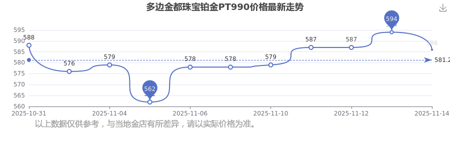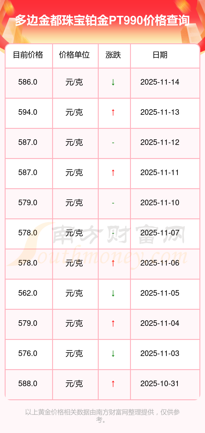 今日多邊金都珠寶鉑金PT990價格最新是586.0元/克。