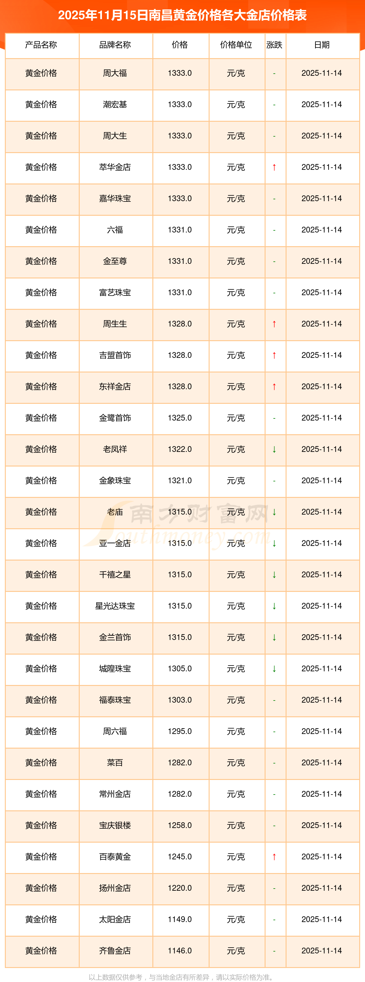 2025年11月15日,南昌周大福、周大福、周大福、周大福、周大福、周大福、周大福、老鳳祥、老鳳祥、老鳳祥、周六福等各大金店品牌黃金價格今日價格如下:周大福1333.0元/克、周大福646.0元/克、周大福1333.0元/克、周大福46320.0、周大福18410.0、周大福41780.0、周大福1167.0元/克、老鳳祥1322.0元/克、老鳳祥600.0元/克、老鳳祥1322.0元/克、周六福1295.0元/克。