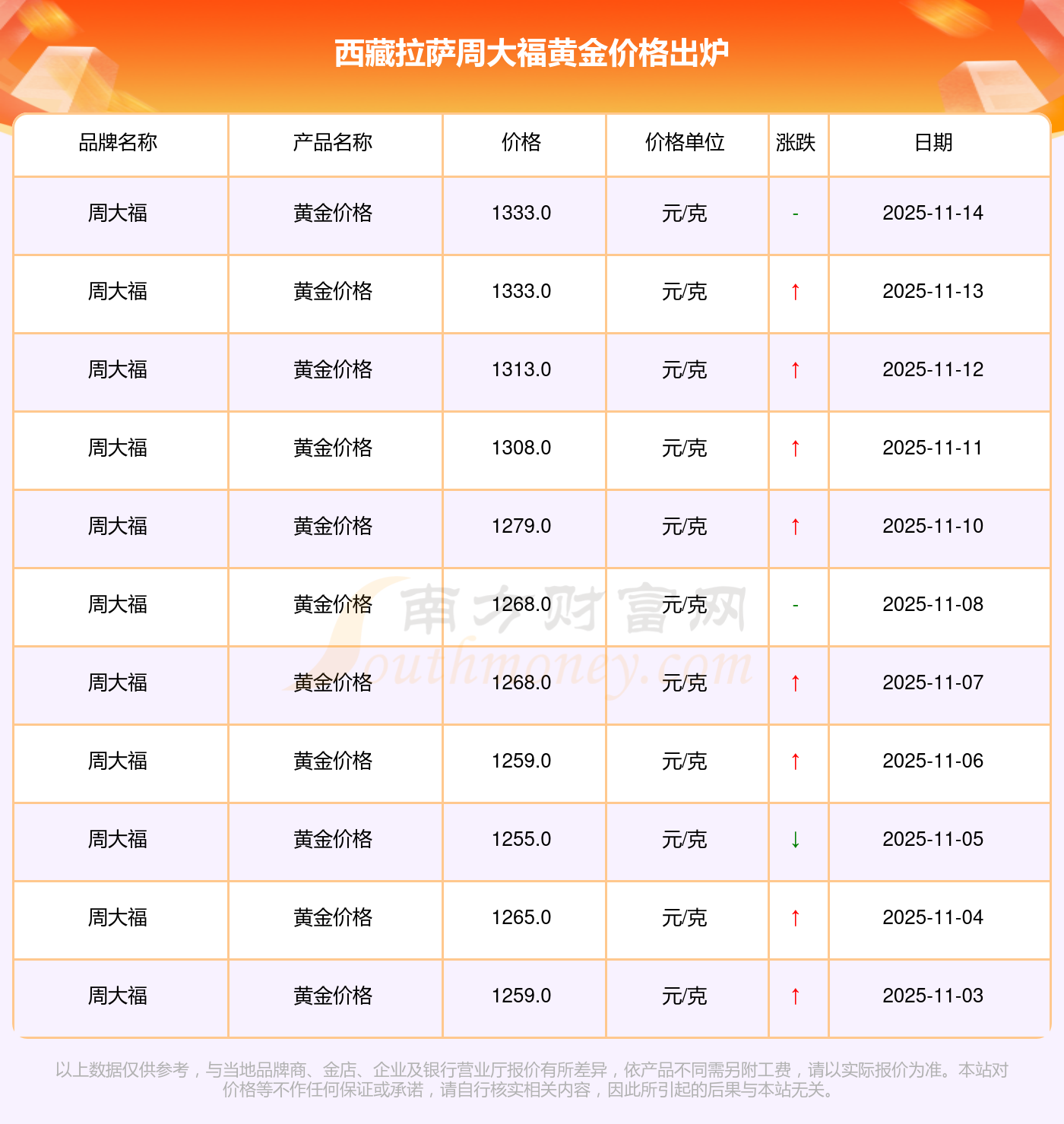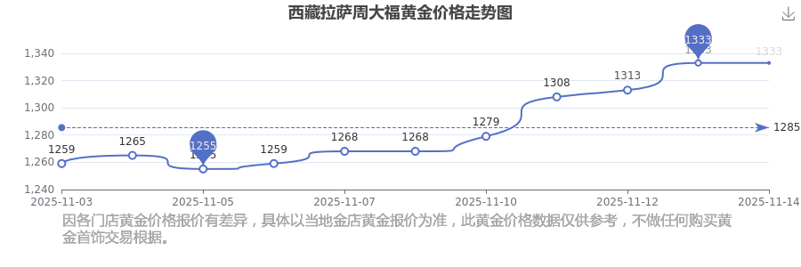 今日(2025年11月15日),1333.0元/克是西藏拉薩周大福黃金價格的價格標準。