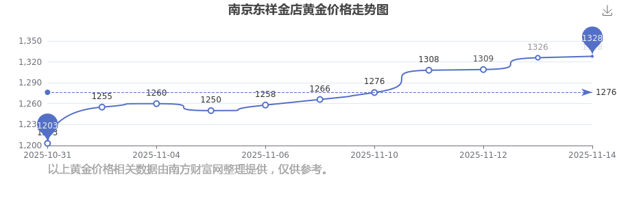 南京東祥金店 2025年11月15日的黃金價格價位為 1328.0元/克。