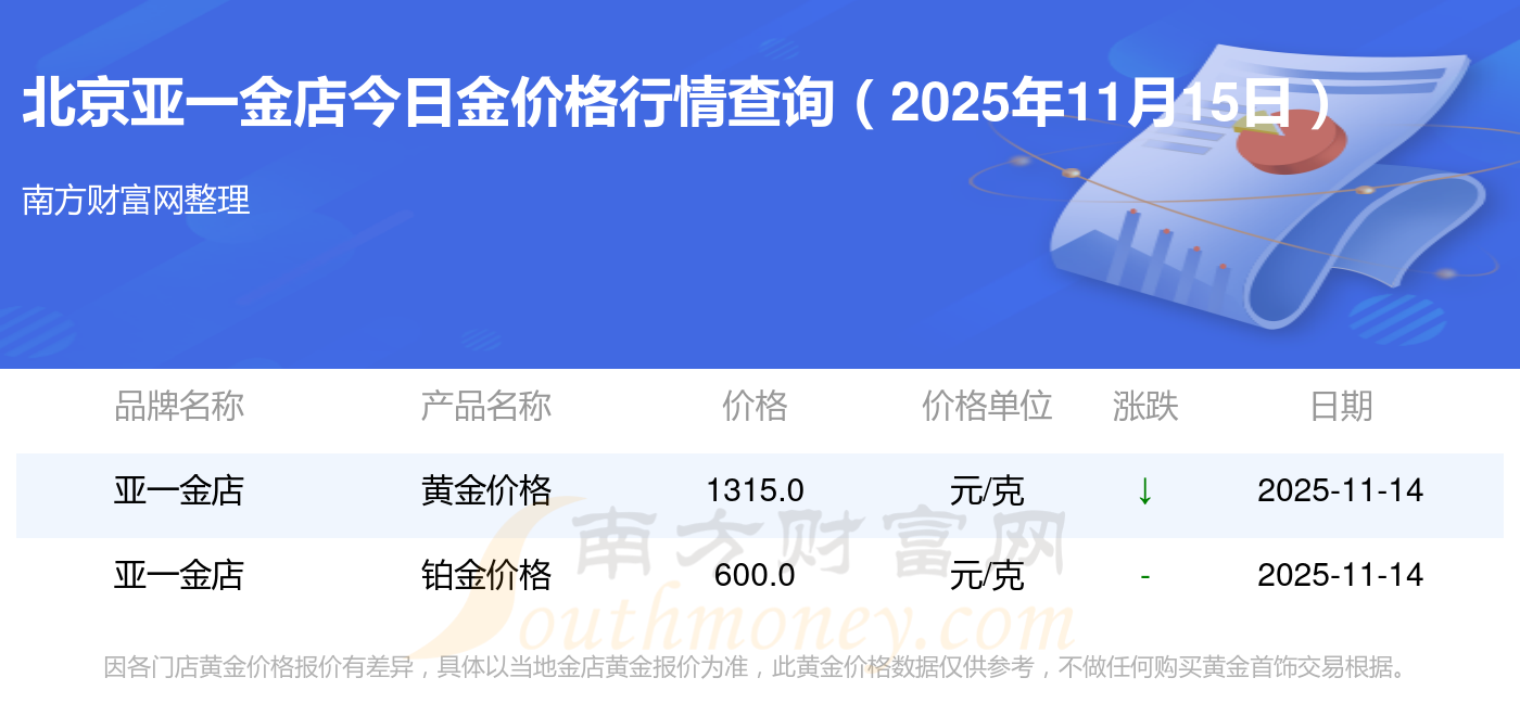 想查詢當(dāng)下黃金價(jià)格,今日黃金一克的價(jià)格是多少呢?2025年11月15日北京亞一金店黃金的單價(jià),一克為多少?黃金價(jià)格1333.0元/克,鉑金價(jià)格646.0元/克,飾品金價(jià)(內(nèi)地)1333.0元/克,黃金飾品(香港)46320.0,鉑金價(jià)格(香港)18410.0,金條價(jià)格(香港)41780.0,金條金價(jià)(內(nèi)地)1167.0元/克,黃金價(jià)格1322.0元/克,鉑金價(jià)格600.0元/克,足金價(jià)格1322.0元/克,黃金價(jià)格1295.0元/克。