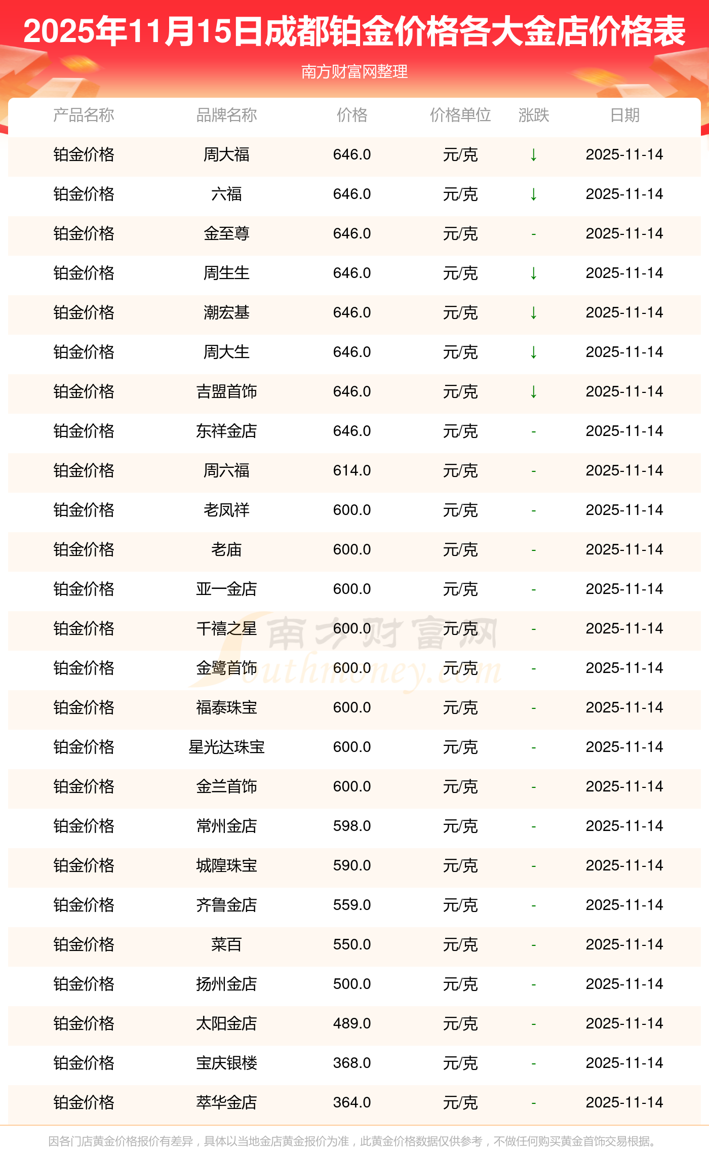 總之,今日成都鉑金價格最高的金店是周大福,報價646.0元/克,鉑金價格最低的金店是萃華金店,報價364.0元/克。今日鉑金價格高低差為282元/克。